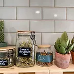 Gäste können ihre eigenen Mahlzeiten in einer voll ausgestatteten Küche zubereiten sowie in einem Essbereich im Freien speisen. Es gibt auch eine Kaffee-/Teemaschine, einen Kühlschrank und Küchenutensilien in der Küche.